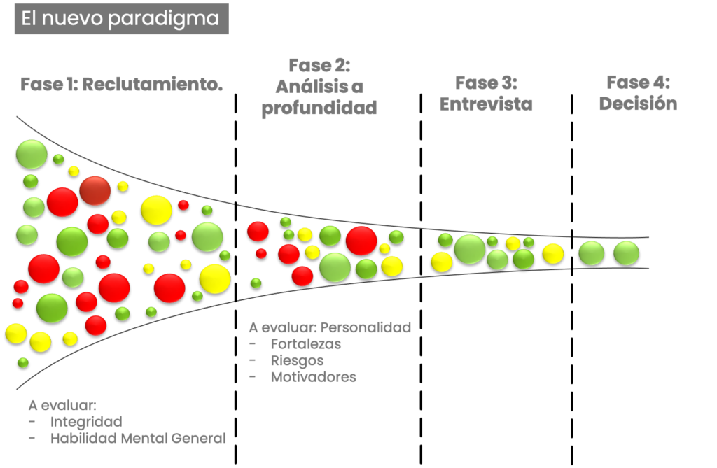Esto quiere decir que, de entrada, la totalidad de los candidatos (que se ajusten al perfil) deberían ser evaluados inicialmente en dos líneas: Integridad y Habilidad Mental General. A esto se le llama pre-screening, y replantea la idea de aplicar las herramientas únicamente a los candidatos finalistas.